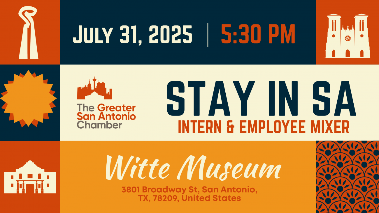 We invite you and your talent attraction team to join us for the 5th Annual Stay in SA Intern Mixer. This free event will provide college interns the chance to understand the professional opportunities, lifestyle, and culture of San Antonio by connecting with local professionals and community leaders like yourself in a showcase on why our hometown in the logical place to launch a career.