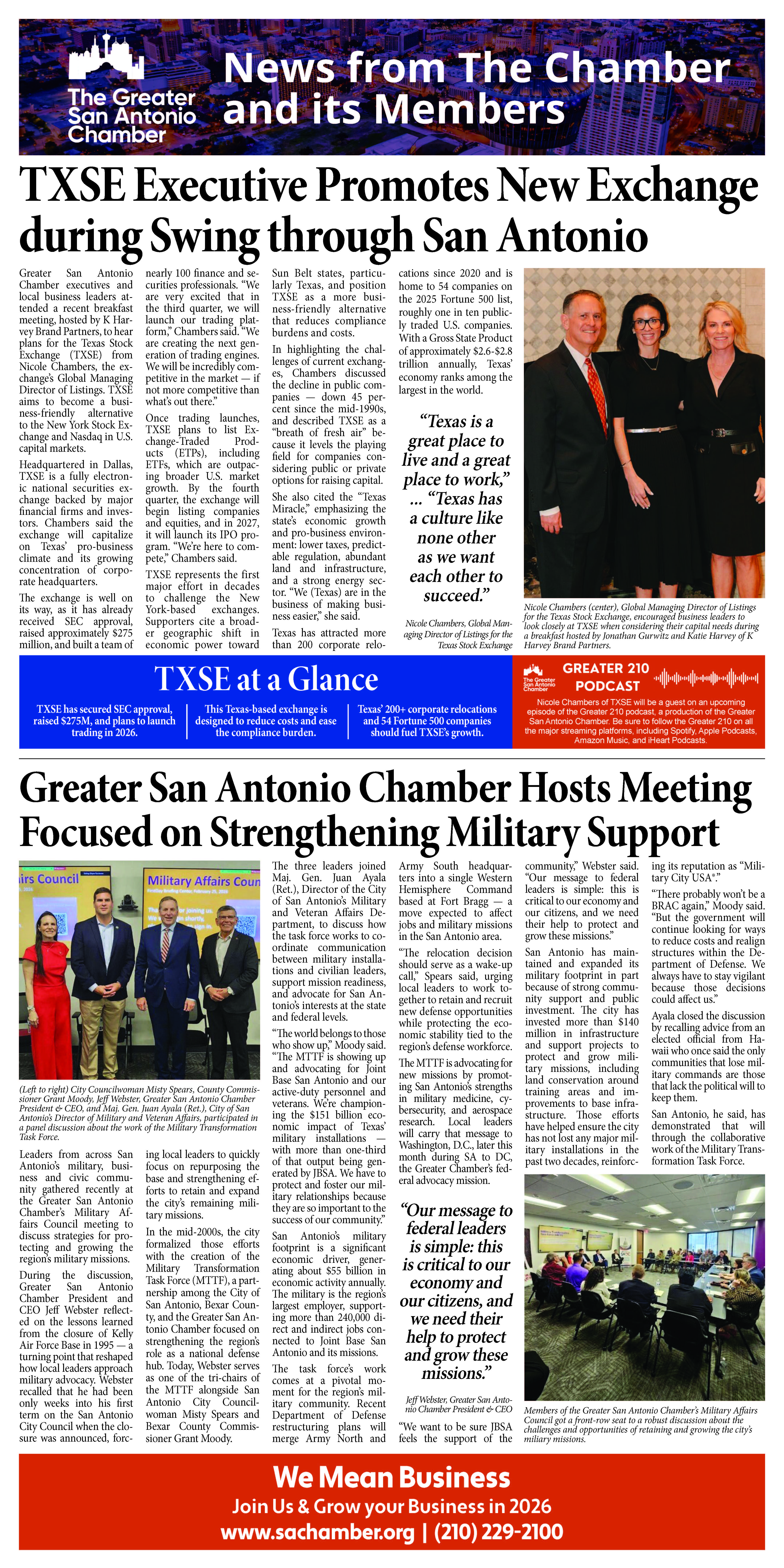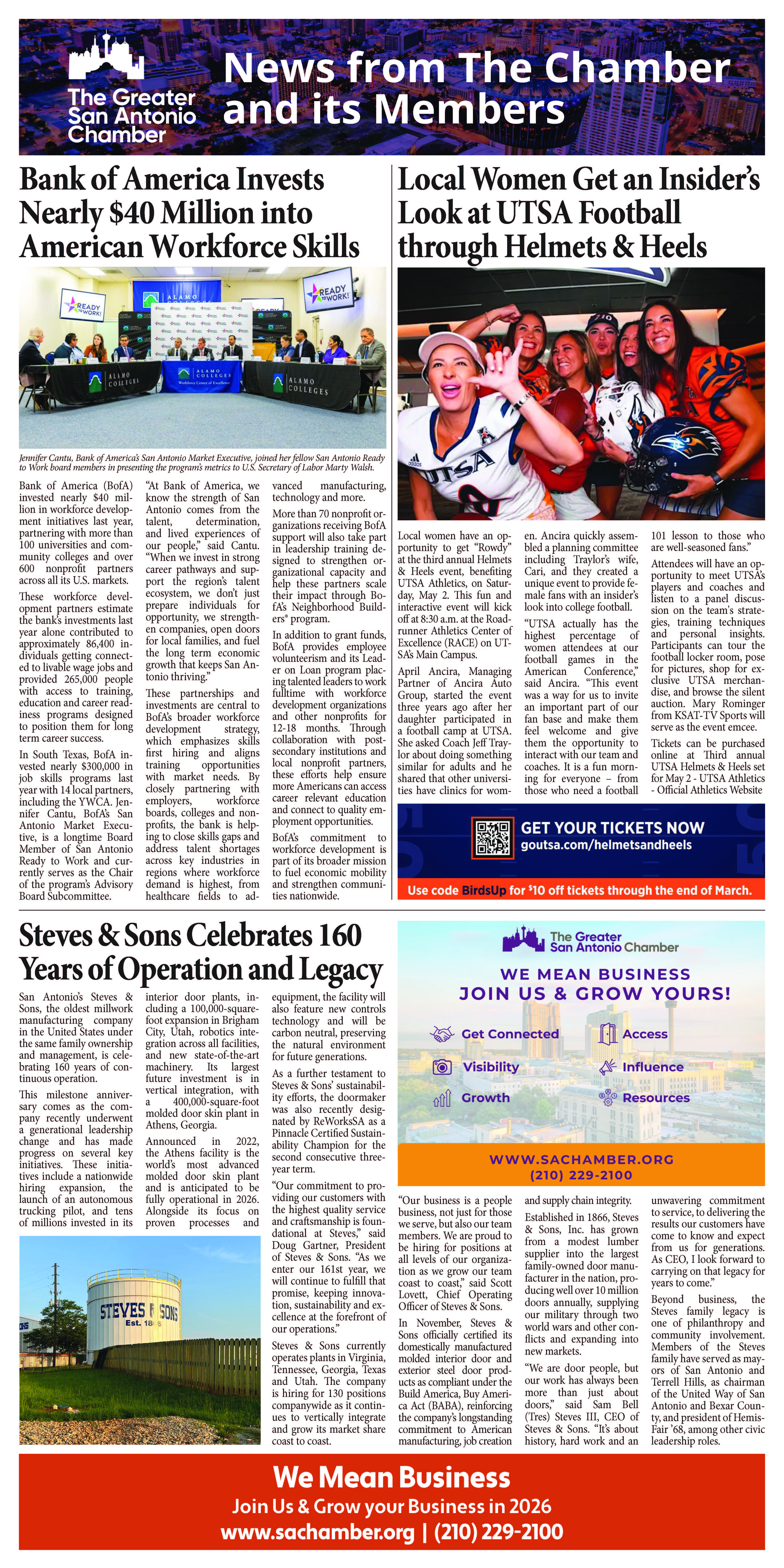This edition highlights the Texas Stock Exchange, which will ring its “opening bell” later this year, offering companies the opportunity to raise capital with lower costs and fewer compliance hurdles than other exchanges. We also spotlight the Military Transformation Task Force — chaired by Jeff Webster, Misty D. Spears, and Grant Moody — as they work to strengthen San Antonio’s standing as Military City, USA. 🇺🇸 Plus, learn how you can get an insider’s look at the UTSA Roadrunners football program through the interactive Helmets & Heels experience created by April Ancira Thompson. In member news, Bank of America has invested nearly $40 million in workforce development initiatives nationwide, including a major investment in San Antonio, while Steves & Sons, Inc. celebrates an impressive 160 years in operation.